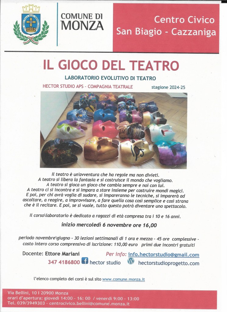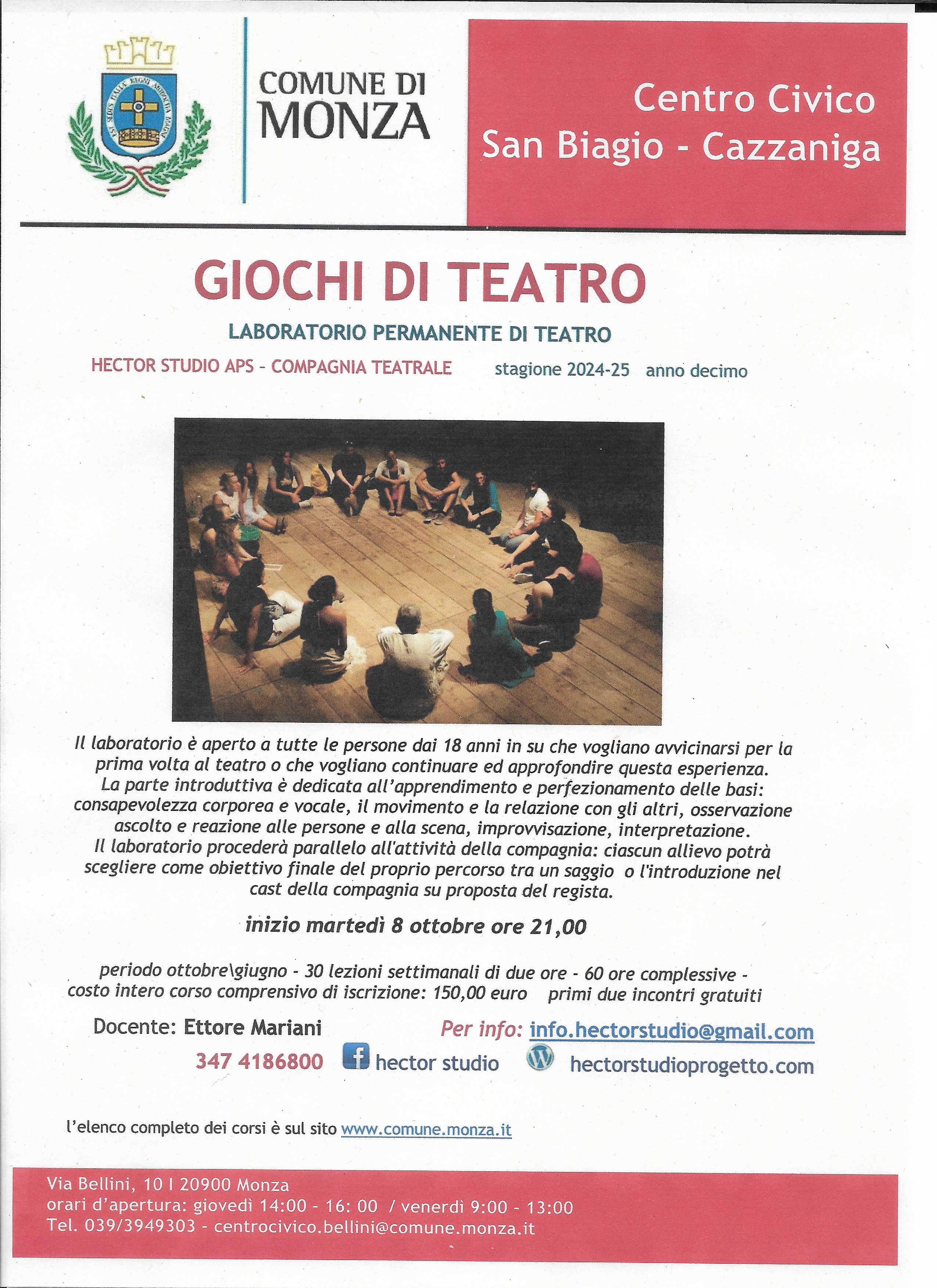 Quest’anno proponiamo due laboratori, uno dedicato agli adulti e uno ai più giovani. La nostra attività è parallela a quella della Compagnia Teatrale, per cui si inizia con l’impostazione classica dei corsi per poi evolvere in laboratorio, ovvero una mediazione tra le esigenze e i caratteri di coloro che partecipano ai gruppi di lavoro e gli spettacoli che sta allestendo la compagnia Hector Studio. Con la possibilità finale, come specificato nei singoli volantini, di un saggio degli allievi o di un loro inserimento in uno spettacolo della compagnia.